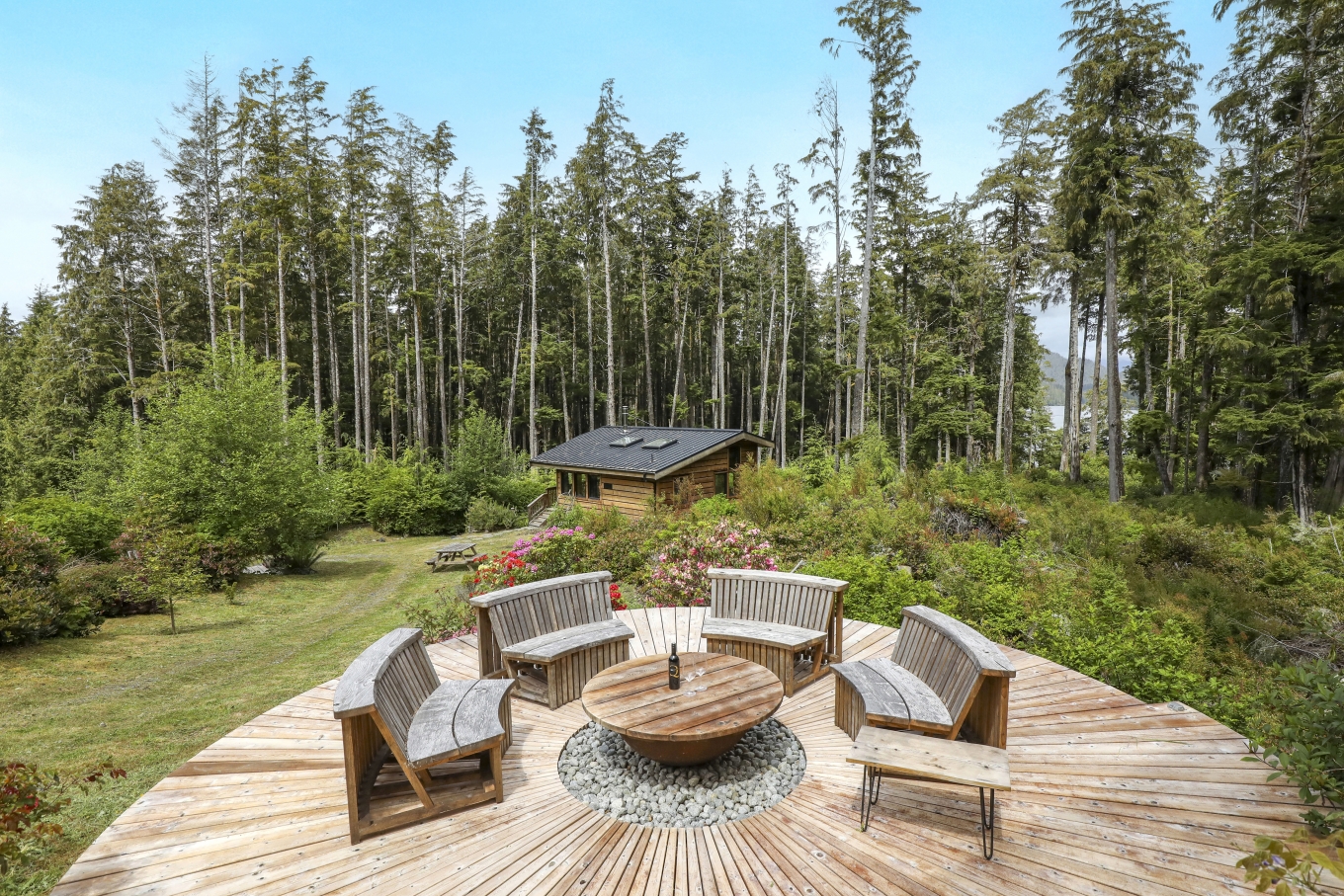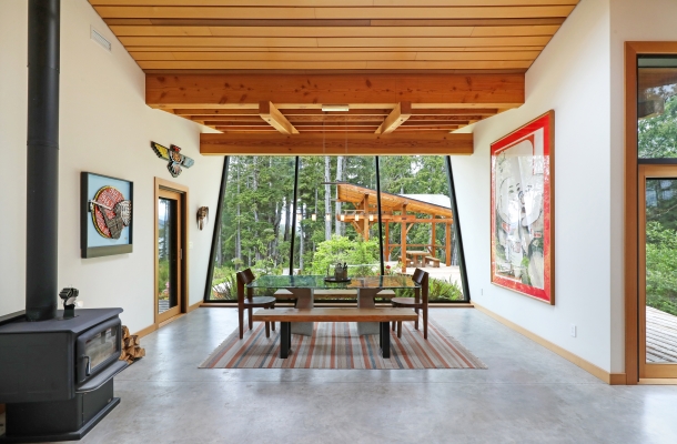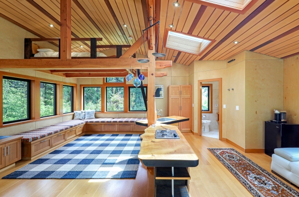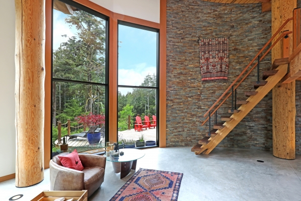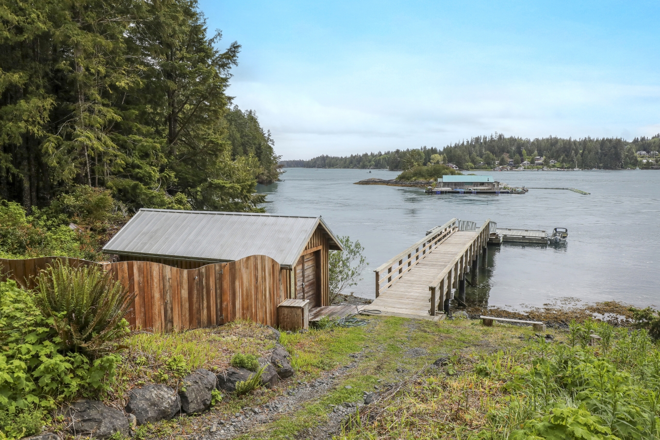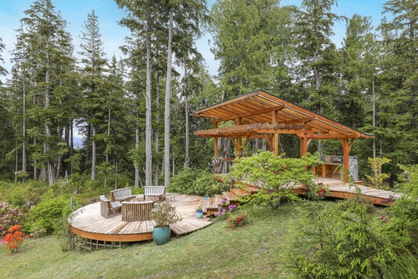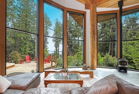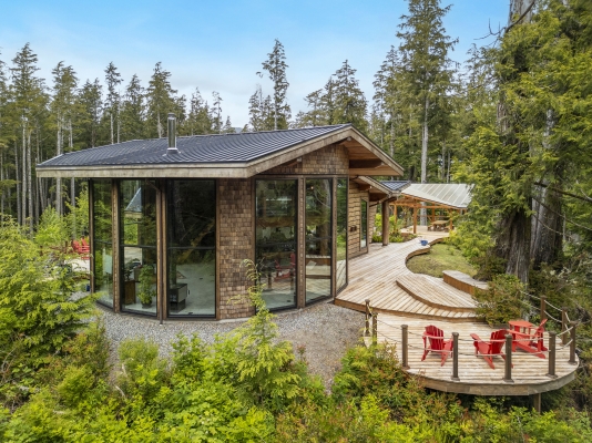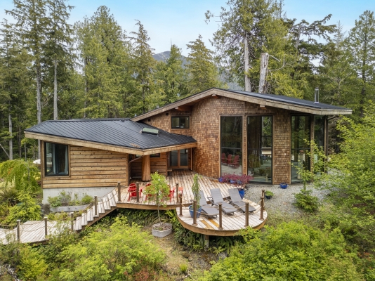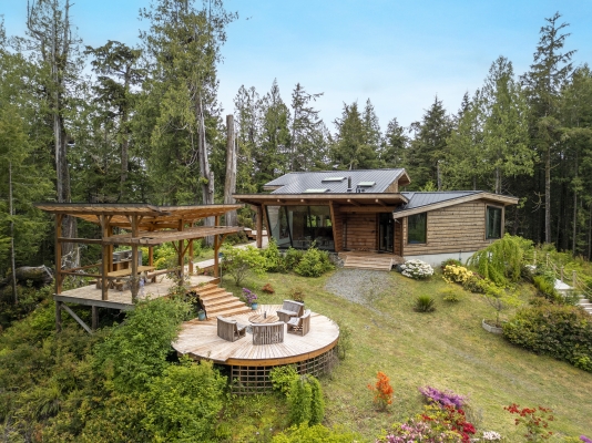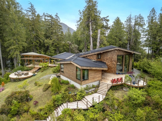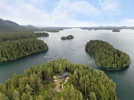 Tucked away on the wild West Coast, this 21.5-acre private island offers a rare chance to live in harmony with nature. A cozy, architect-designed home with 3 bedrooms and 2 baths sits at its heart, complemented by a lofted guest cabin. Expansive windows frame matchless coastal views, while five sitting areas provide stunning vantage points. Enjoy good sheltered deep water moorage with wharf, ramp, and float. Wander forest trails and live fully off-grid with modern comforts, a self-sufficient lifestyle boasting solitude.