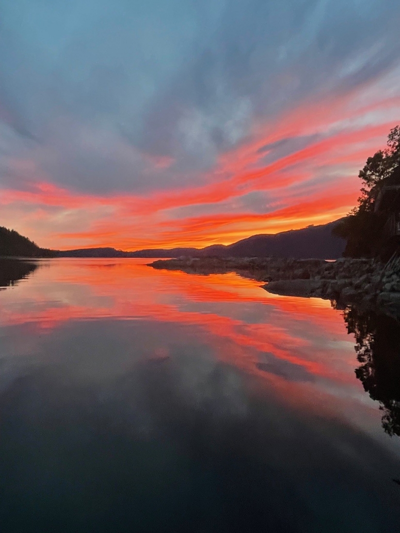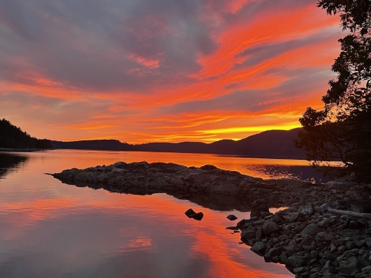 A southerly exposed wrap around deck envelopes the perimeter of the home which extends safely over the calm, weather protected bay. The crystal clear water is warm for swimming in the summer months. The home is built to allow for sun from sunrise to sunset. The sunsets are soleil sans fin!