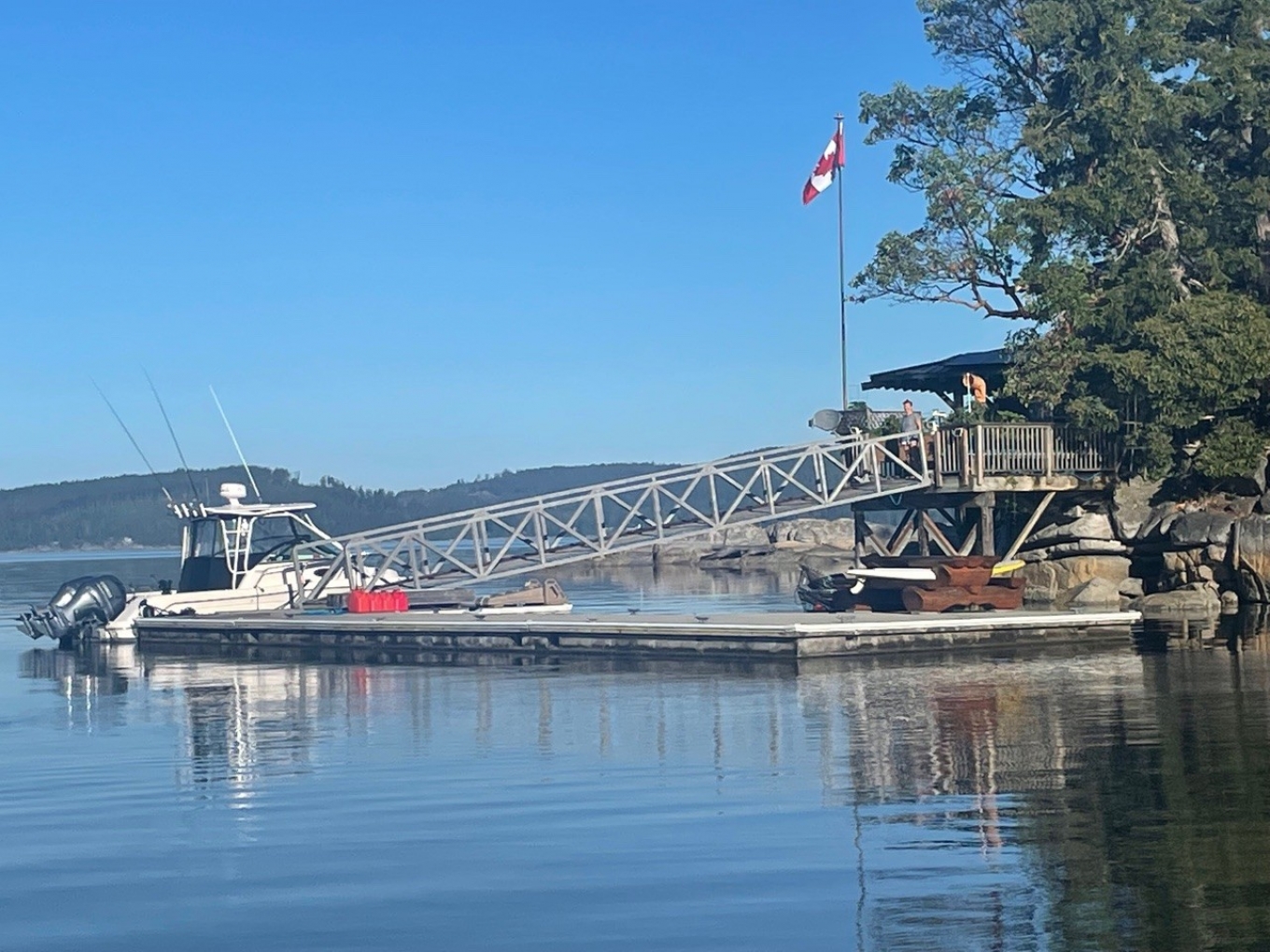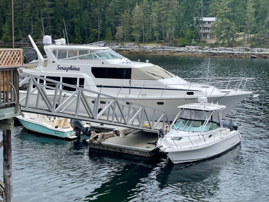 The dock floats are fully permitted, professionally engineered concrete construction and installation. The docks are designed to accommodate a helicopter, and can safely moor a 70 ft plus vessel, still allowing for additional moorage space beyond. The alloy foot ramp to the dock is 6 ft wide and can safely withstand cargo while being wheelchair accessible.
