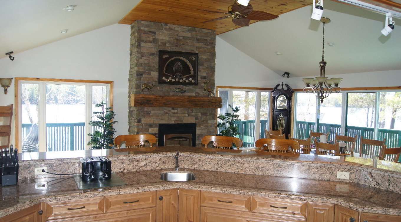 This is an outstanding private island in Bolger Lake with all the luxuries and conveniences of home. The 3 bedroom main cottage is fully winterized and has a kitchen with Sub Zero fridge, Wolf gas stove,dishwasher and island with granite counter tops, living room with stone fireplace and 72″ flat screen TV, hardwood floor and walk out to wrap around deck.