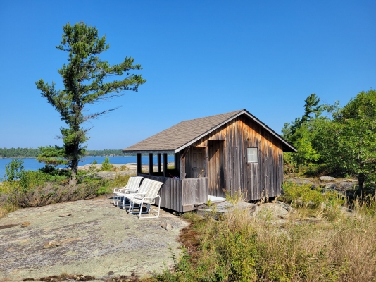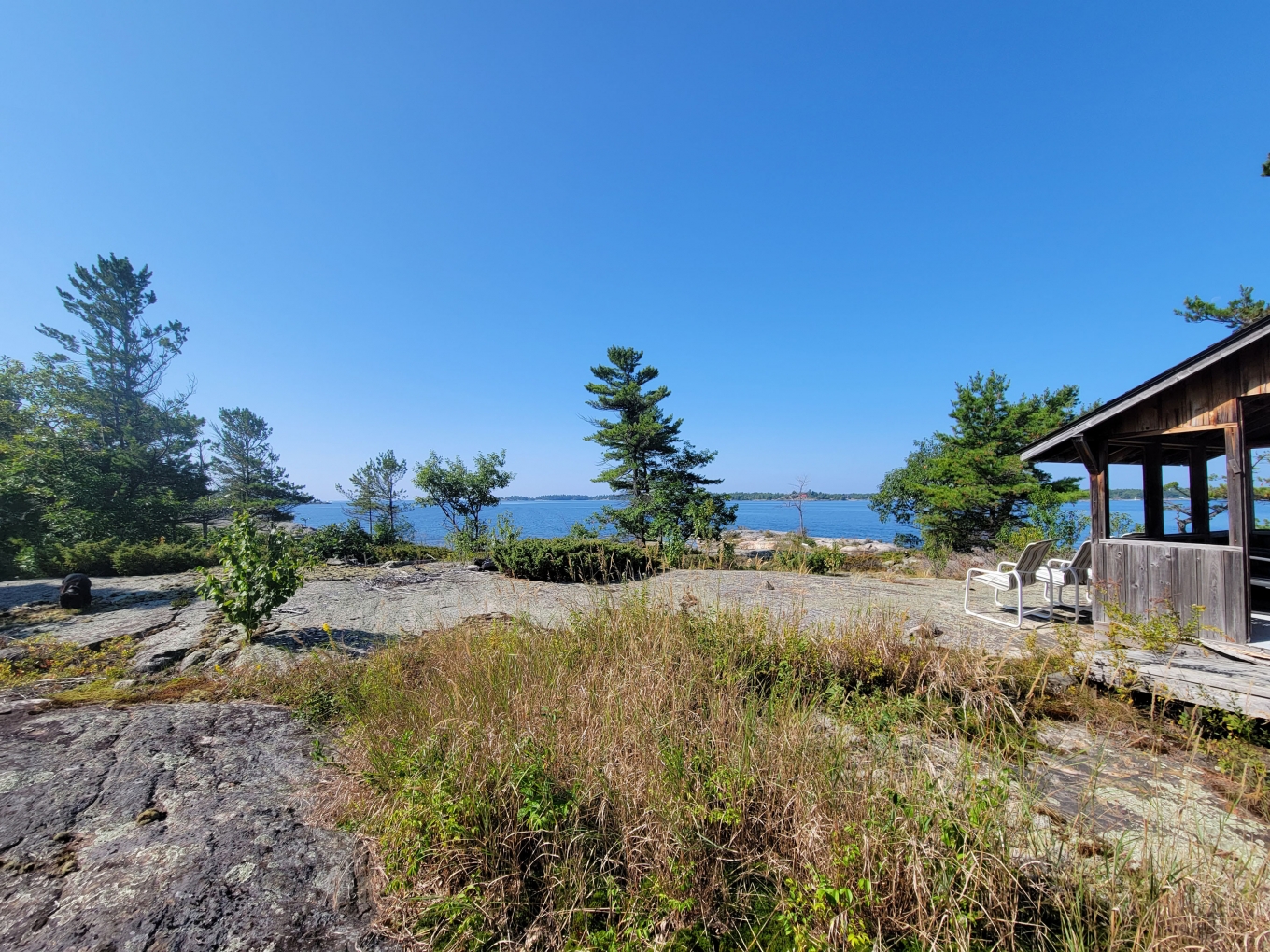 The property already has a self-contained one-bedroom cottage tucked into a pine forest, which features new windows and doors, engineered hardwood floors, and a wood-burning airtight stove—making it easy to take advantage of this prime location now. An additional one-bedroom sleeping bunkie with screened porch sits at the water’s edge. Established hydro and septic system, groomed trails and landscaped pathways, and an elevated building site set the stage for the development of a main cottage in the future, maximizing the investment even further. It’s a serene spot to launch a canoe, cast a line, or simply bask in the sun and bay breezes.