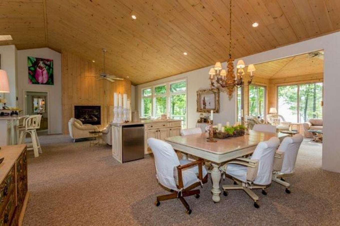 Just steps from the kitchen the dining room is adjacent to the sun room. The space easily accommodates a table for 12 with room to spare.