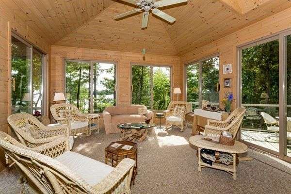 The living room is oriented to the southwest facing window wall, overlooking views filtered through the forest to the open water. Upper operable transoms and ceiling fans allow for cooling air flow. On the south west wall of the great room is a built in entertainment centre and a built in propane fire place.
