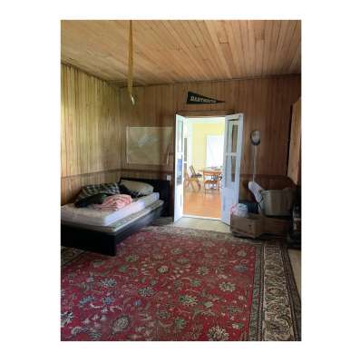 The main building (2000 square feet) has a kitchen with a propane fridge and stove. There is also a pantry and a beautiful screened in sunroom with 360-degrees water view. In addition, there are two other rooms on the main floor (12’x17’). The cottage is original, built with tongue and grove pine in all the rooms. The upstairs has 7 bedrooms that can easily accommodate 12 to 14 people. No electricity or plumbing in the main house.