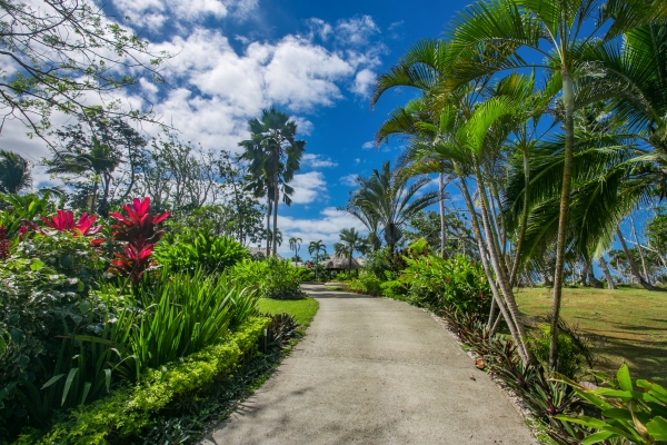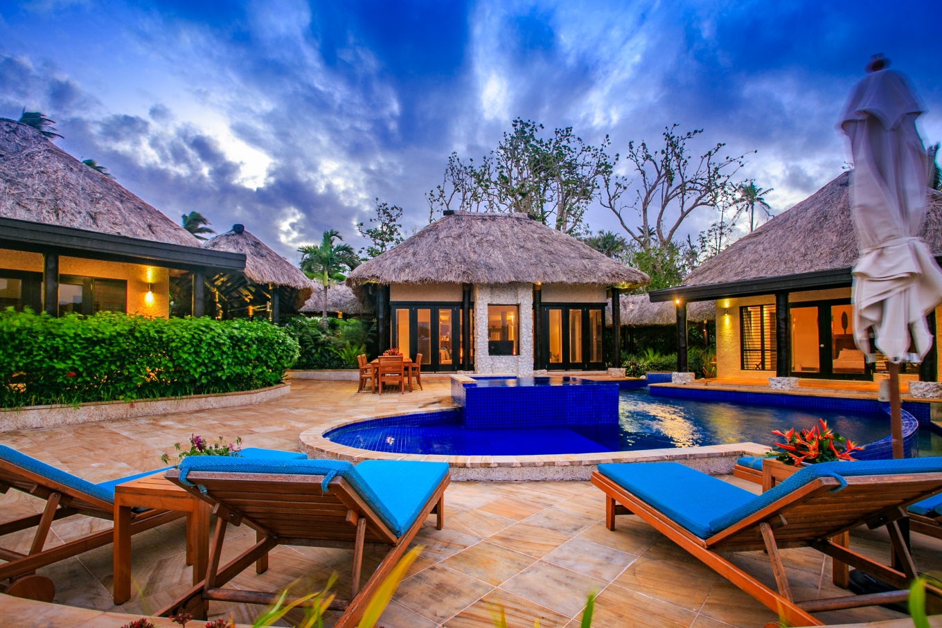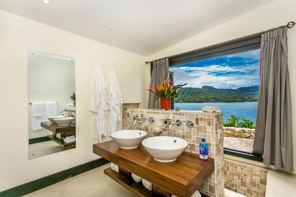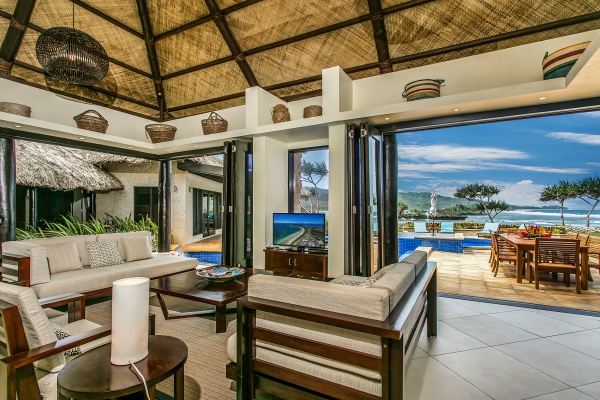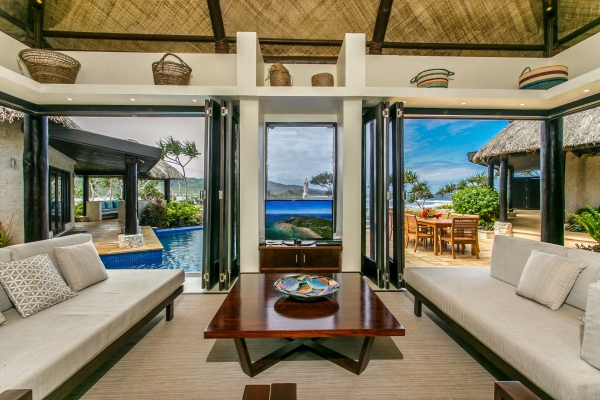 The island’s centerpiece, the Signature Villa, occupies one manicured acre overlooking the sparkling Koro Sea. Designed to complement its tropical surroundings, the residence offers over 3,000 square feet of refined living space. Architectural highlights include a horizon-edge pool and wet-edge spa, a daybed pavilion, a barbecue gazebo, a three-vehicle garage, and covered walkways paved in teak stone. Inside, the villa’s open-plan layout centers around the kitchen, dining, and lounge areas with outdoor living spaces that frame panoramic ocean views. The primary suite features a spacious bathroom and dressing room that open directly to the patio and pool, while two additional bedrooms share a bath and enjoy similar access to the outdoors.