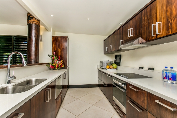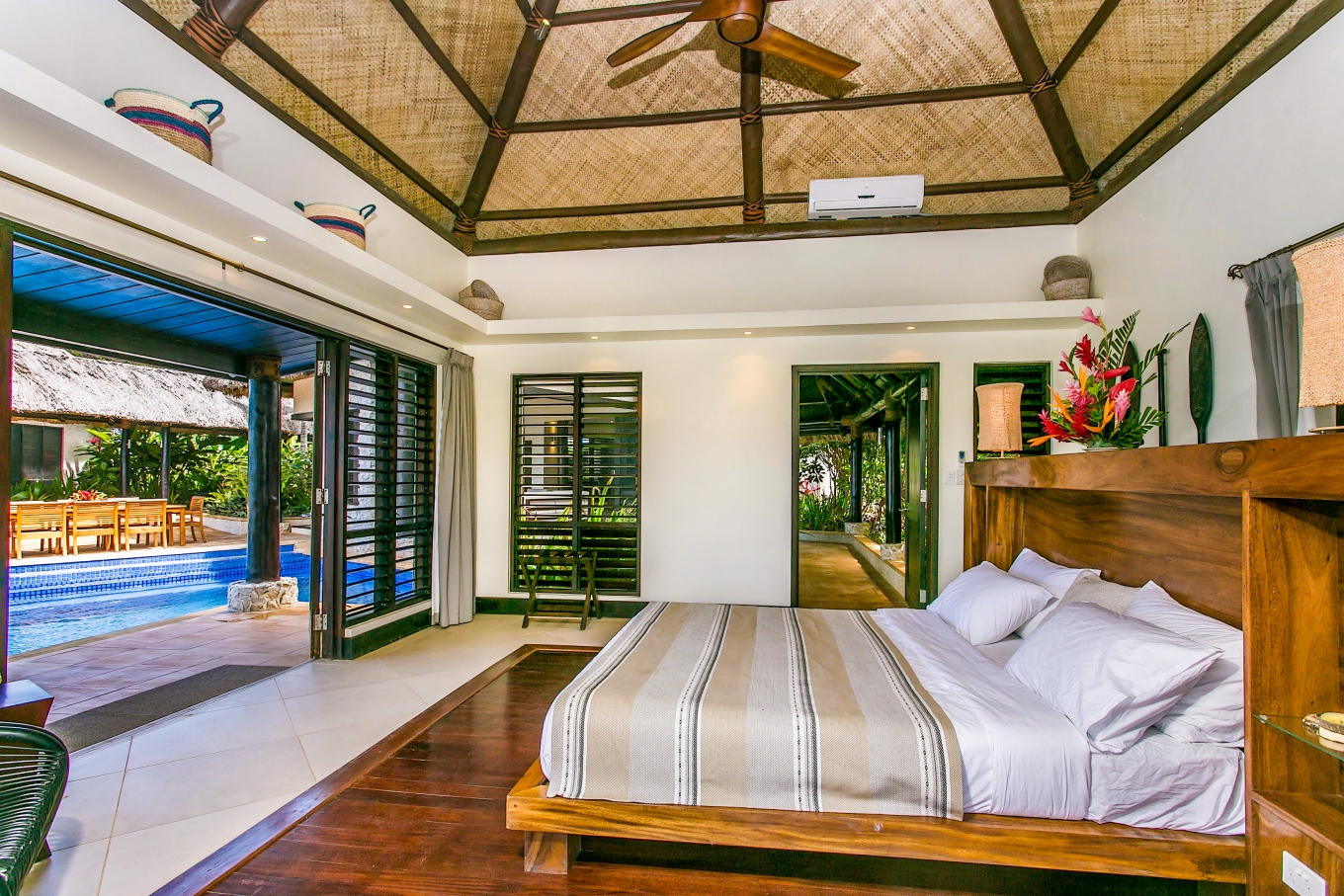 The island’s centerpiece, the Signature Villa, occupies one manicured acre overlooking the sparkling Koro Sea. Designed to complement its tropical surroundings, the residence offers over 3,000 square feet of refined living space. Architectural highlights include a horizon-edge pool and wet-edge spa, a daybed pavilion, a barbecue gazebo, a three-vehicle garage, and covered walkways paved in teak stone. Inside, the villa’s open-plan layout centers around the kitchen, dining, and lounge areas with outdoor living spaces that frame panoramic ocean views. The primary suite features a spacious bathroom and dressing room that open directly to the patio and pool, while two additional bedrooms share a bath and enjoy similar access to the outdoors.