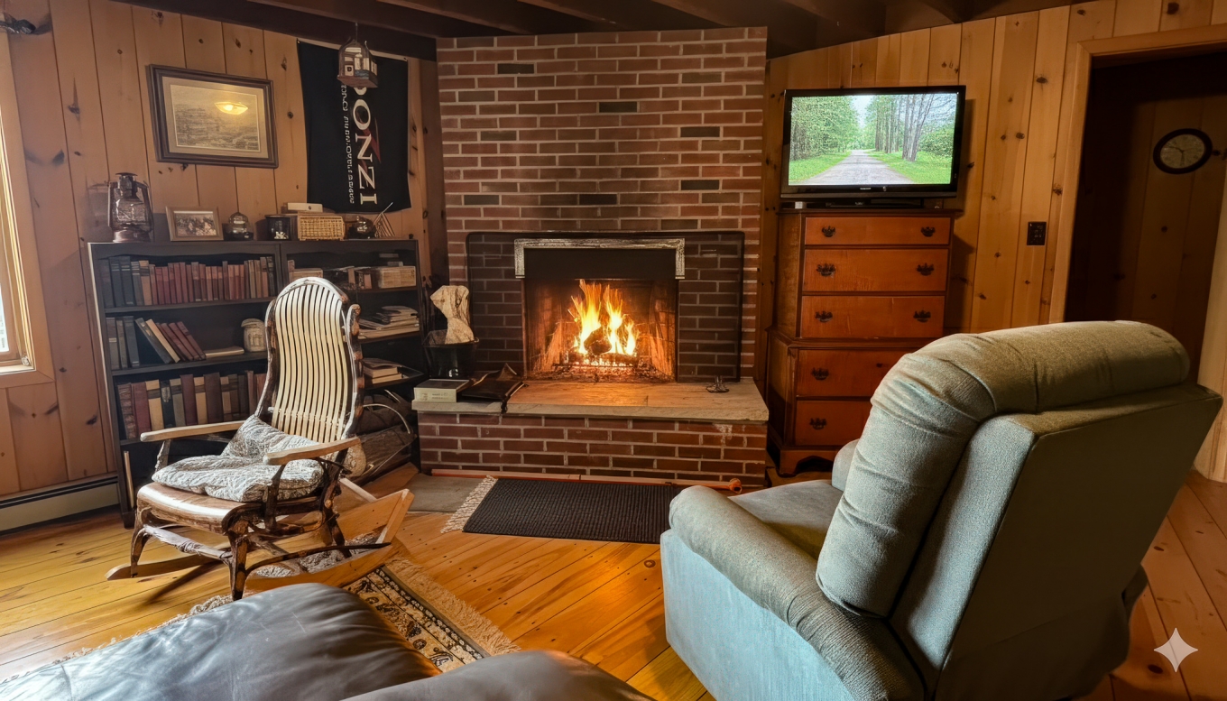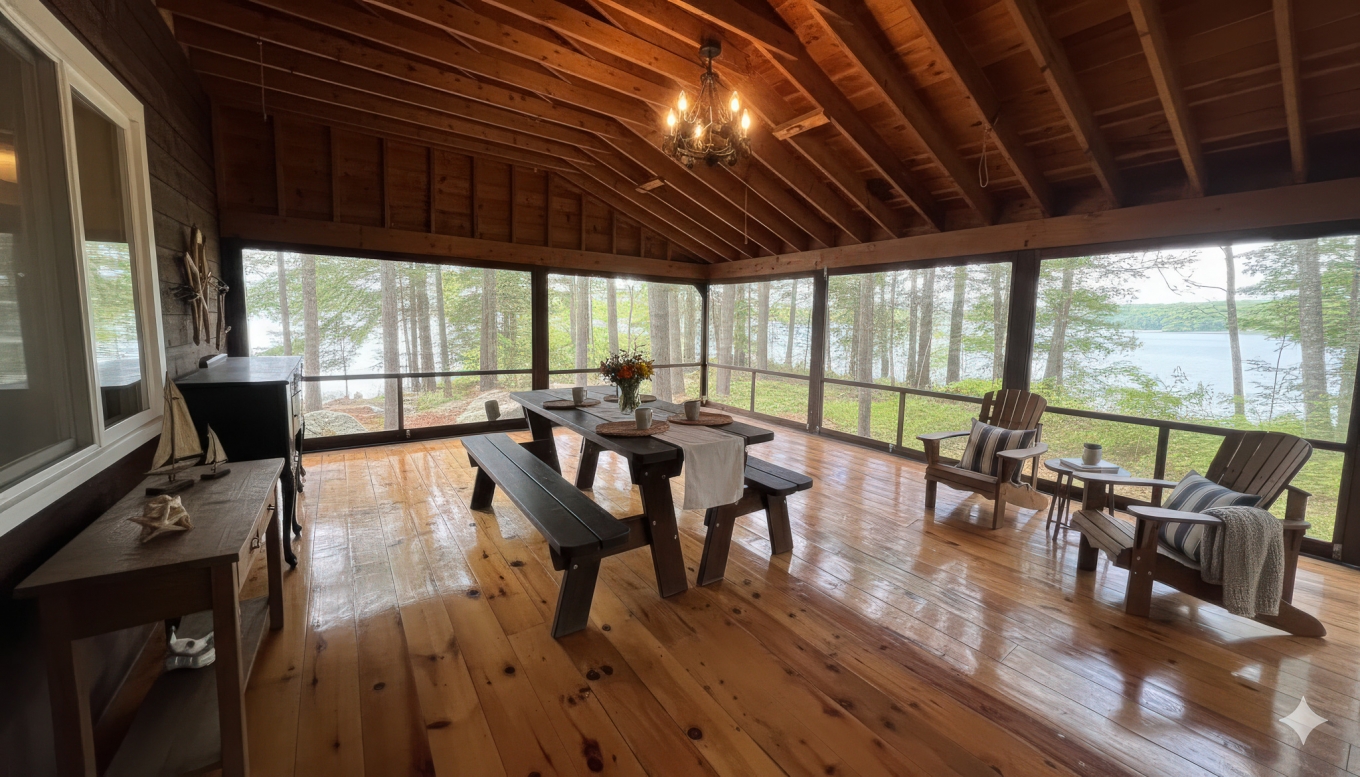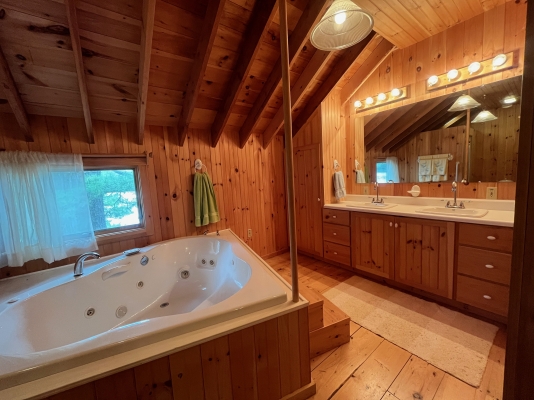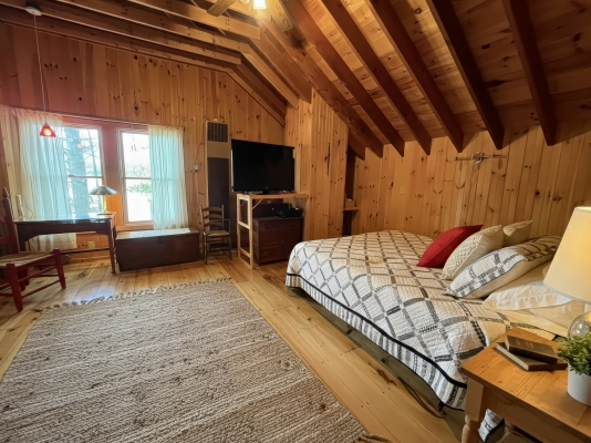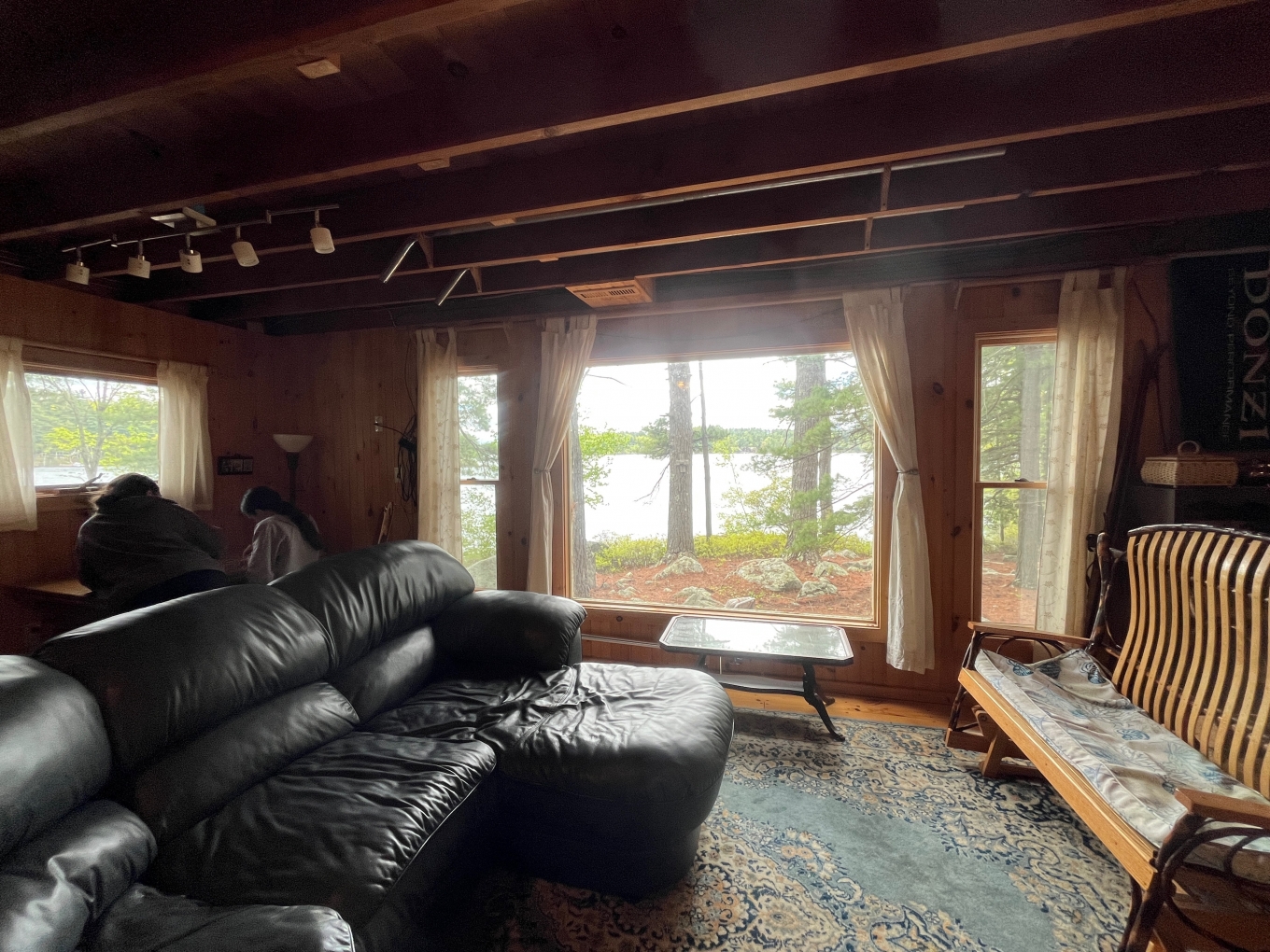The main house has spectacular lake views from every room except the first-floor bathroom. The great room features adjacent screened porch with chandelier lighting, while the master suite has a heated two-person jetted hot tub and walk-in closet. The island is powered by mainland electricity delivered through an underwater transmission cable, with a 12,000+ watt auxiliary generator for backup power during outages. The main house is heated and air-conditioned by a five-ton HVAC with a four-zone Honeywell system, and it also features a central brick fireplace with hearth and auxiliary heating.